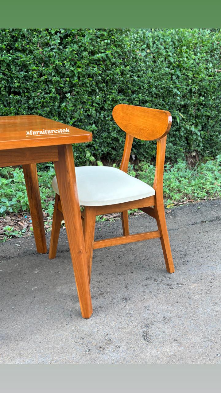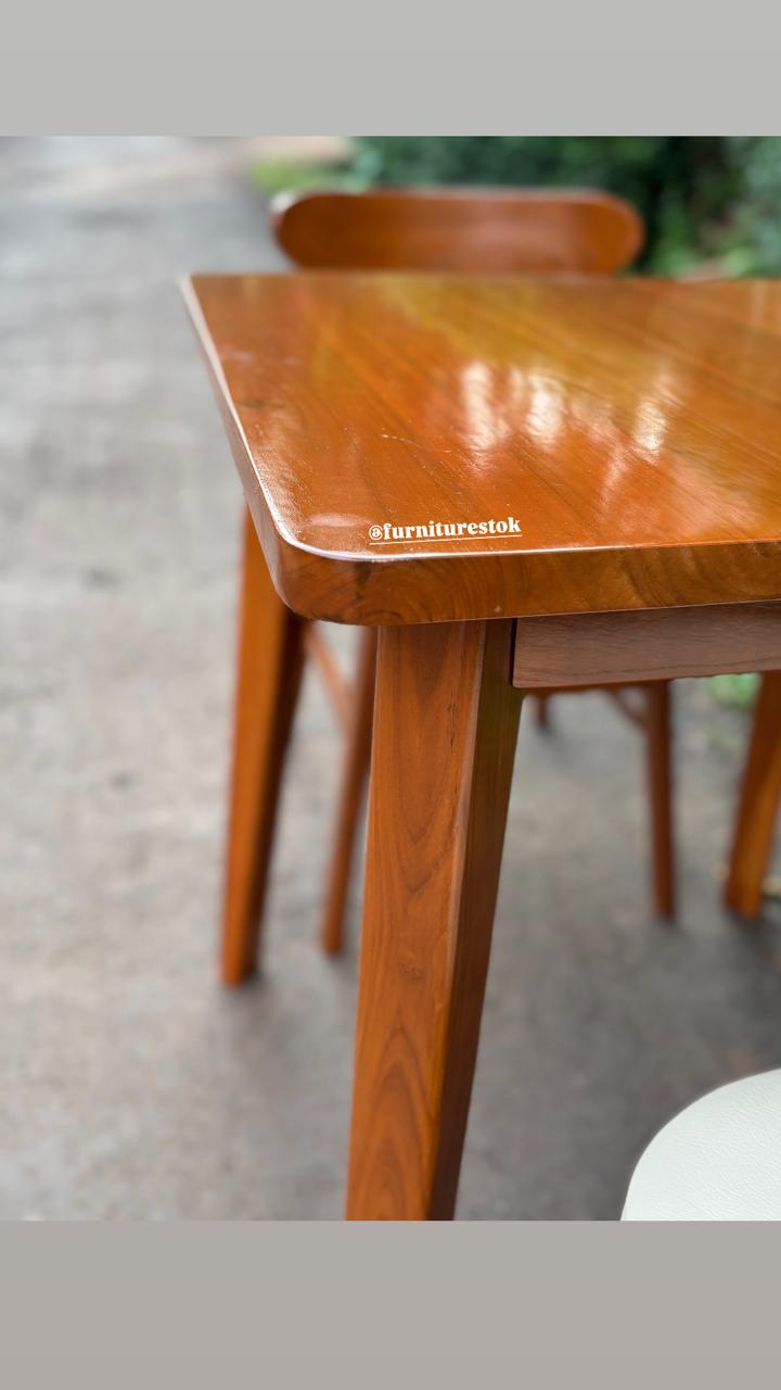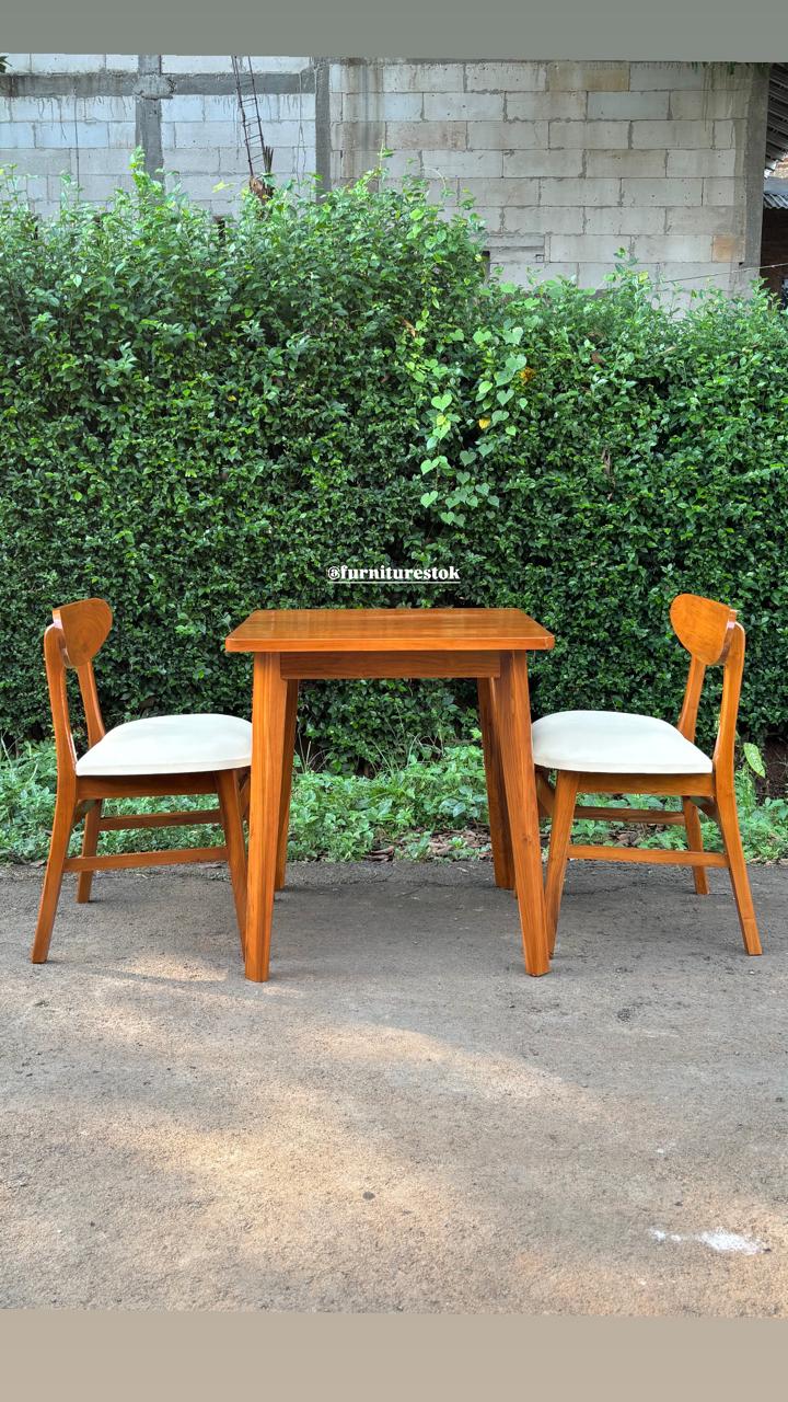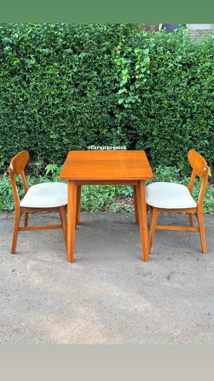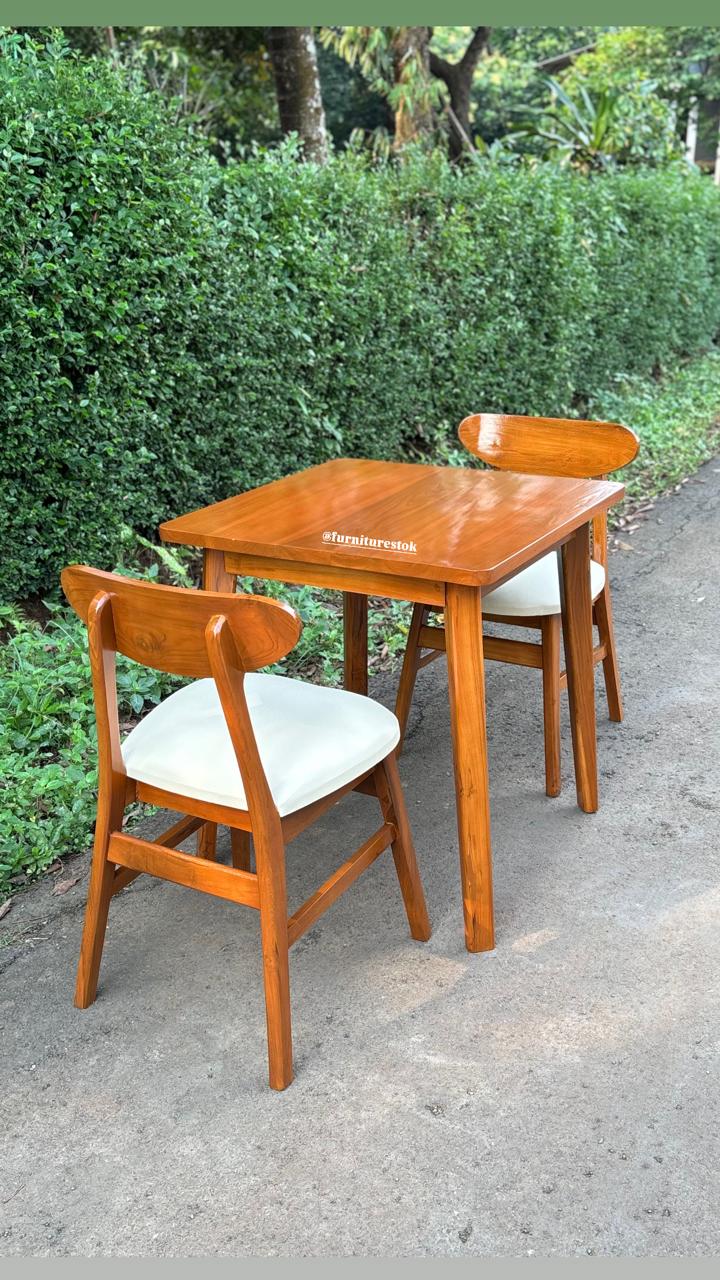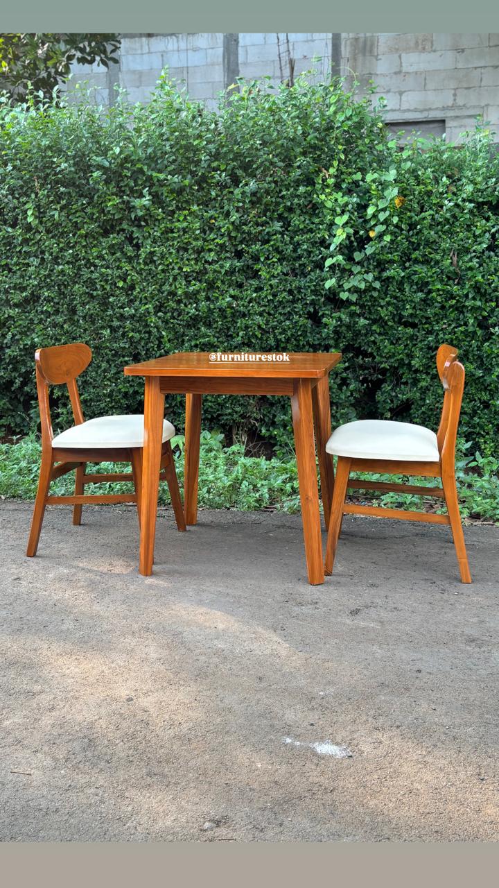 Ukuran meja yang proporsional dipadukan dengan dua kursi ergonomis, menciptakan kenyamanan saat makan bersama pasangan atau keluarga kecil. Desainnya sederhana namun tetap elegan, mudah dipadukan dengan berbagai konsep interior seperti minimalis, industrial, hingga Scandinavian.