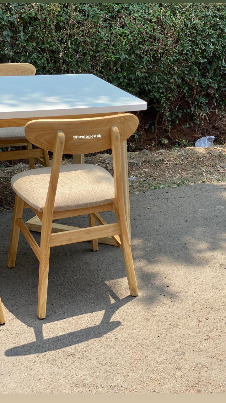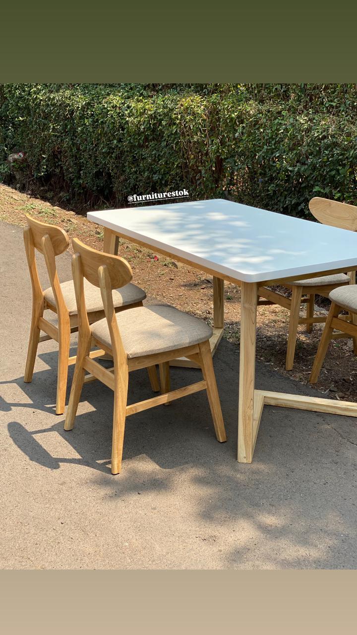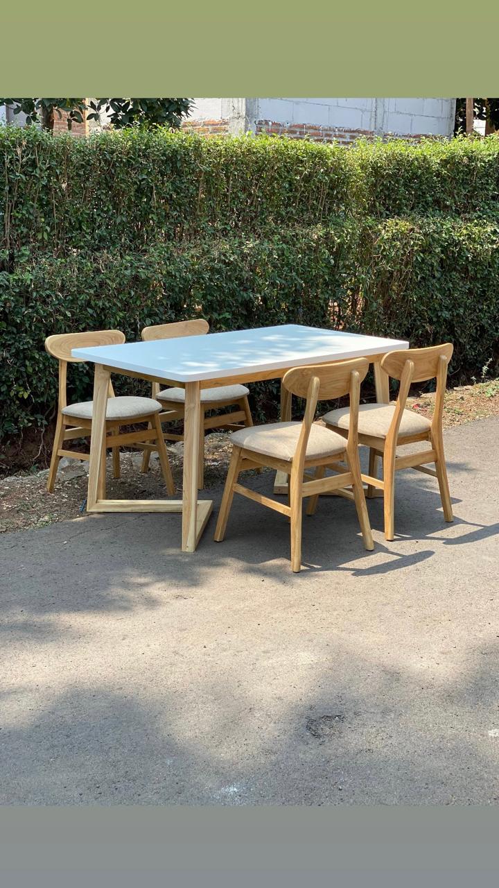 Meja makan berukuran panjang 140 cm, lebar 80 cm, dan tinggi 75 cm, ideal untuk kebutuhan keluarga kecil hingga menengah. Dilengkapi 4 kursi makan jati yang kokoh dan nyaman digunakan untuk aktivitas makan bersama setiap hari.